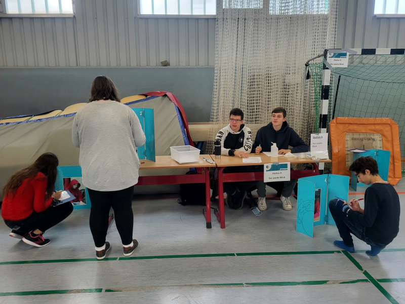 Die Klassen 8 und 9 haben in unserer Turnhalle an 15 verschiedenen Stationen, vorher in Gruppen aufgeteilt, mit einem Laufzettel die Aufgaben zur Gesundheitserziehung bewältigt. Die Klassen 10 betreuten die Stationen.