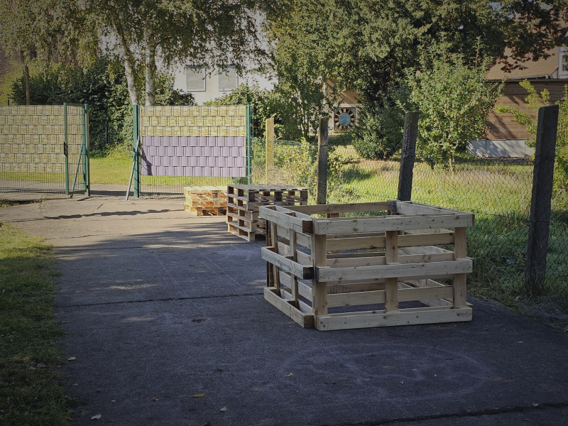 Überdachte Sitzbänke und Sand für das Klettergerüst auf dem kleinen Schulhof